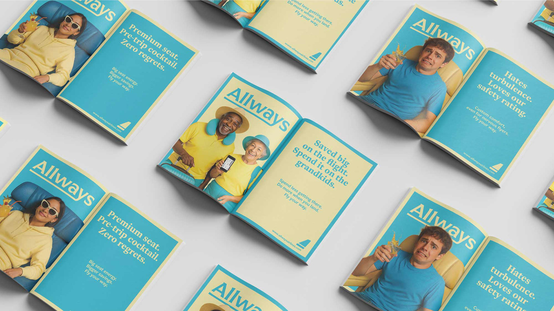 Allways is a rebrand for a major airline, designed to rebuild trust, broaden appeal, and showcase the value of customizable travel when abroad. The identity system centers on bold, sunny visuals and crisp, character driven copy that speaks to travelers across the spectrum - from budget conscious fliers to value driven luxury seekers. All photos were generated using AI and fully art directed to match the campaign’s vision, casting a diverse range of personas to reflect real customer choice. Built on the concept “maximize your travel", the brand positions the airline as flexible, safe, and smart - whether you're booking a premium seat or flying on a deal. Creative Direction · Brand Concept · Logo Design · Ad Campaign · Graphic Design · Copywriting · Art Direction · AI Collaboration